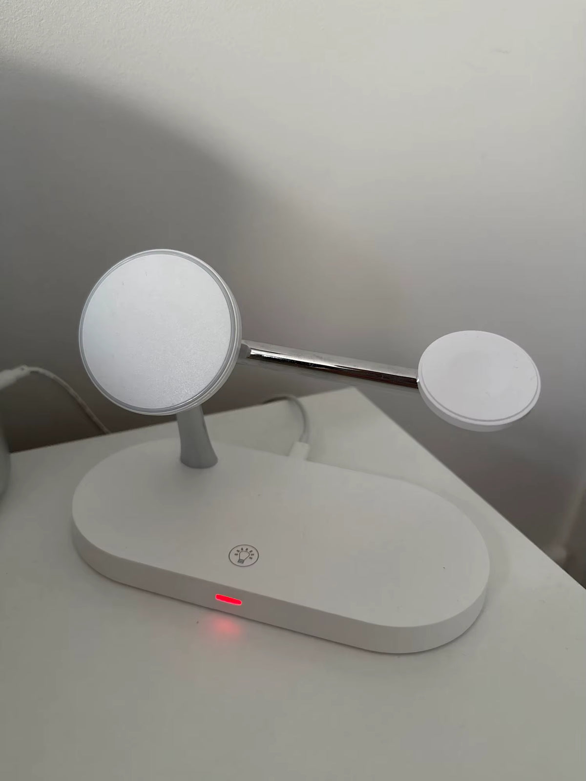 Answer 3: Absolutely! The charging stand boasts a space-saving vertical design that promotes a minimalist aesthetic, easily fitting on nightstands, desks, or countertops without creating clutter.